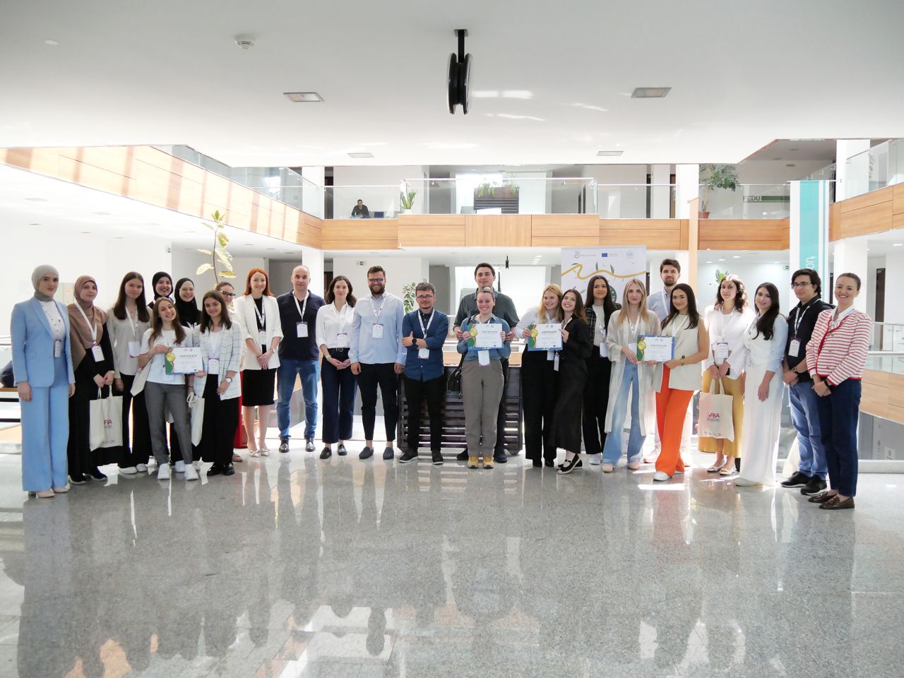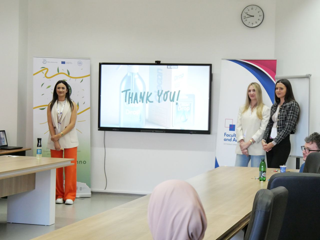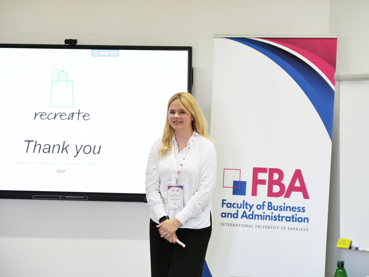 A five-member jury composed of Dr. Šejma Aydin, Dr. Emir Hambo, Dr. Nerma Omićević, Dr. Jasmin Šutković, and Deniz Durmuş, MSc had a challenging task of evaluating 12 business ideas by 22 students in two stages: written plans and presentations. Ultimately, the jury decided to award the top three business projects (alphabetically ordered: Clean Drop by Siradža Laletović, Lamija Tanović, and Nejra Hodžić; Dara Engineering by Damir Hanić and Amra Maglajčetović; and Recreate by Selma Krivokapa), while special award went to the best high-school project (Glass Revive Factory by Eva Kuruzović and Lidija Volf).
